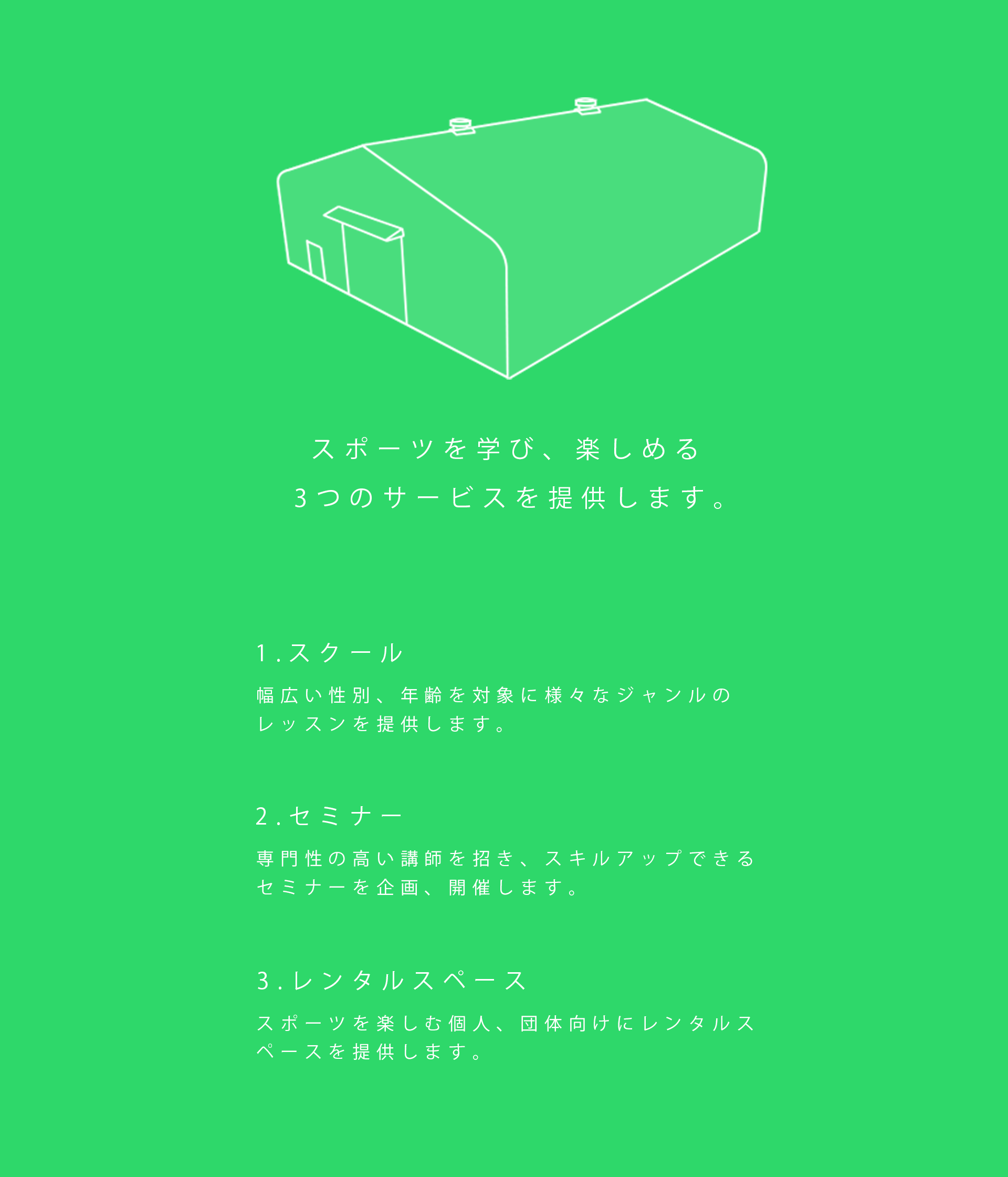 1.スポーツ施設の運営 2.スポーツ教室の運営 3.スポーツに関わるセミナーの開催、運営 4.スポーツに関わる資格の認定、運営 5.スポーツに関わる商品の開発、販売 6.前各号に附帯する一切の業務 |
